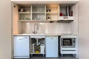 O apartamento tem uma cama de casal queen size, uma sala de estar com um confortável sofá, e a kitchnette é completamente equipada para preparar qualquer refeição, dispondo ainda de máquina de louça.