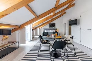O apartamento possui uma mesa para refeições e um sofá confortável que pode ser transformado em um sofá-cama.