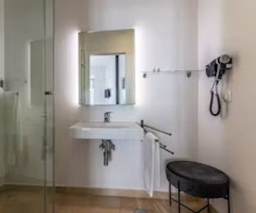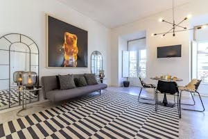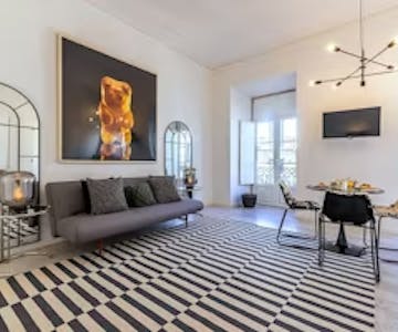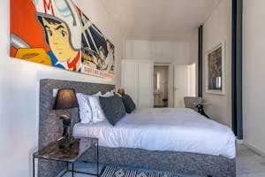 O apartamento tem um quarto espaçoso e luminoso (a casa de banho comunica com o quarto) para três adultos com uma pequena varanda e kitchenette totalmente equipada, incluindo máquina de lavar loiça. Os seus tetos altos contam com grandes obras de Luis Alegre e Pedro Amaral. A casa-de banho situa-se no quarto de casal.