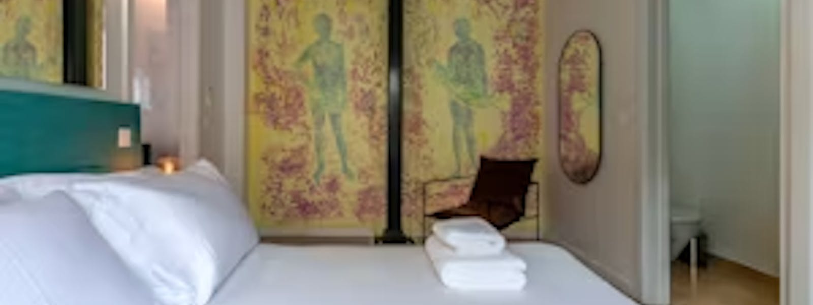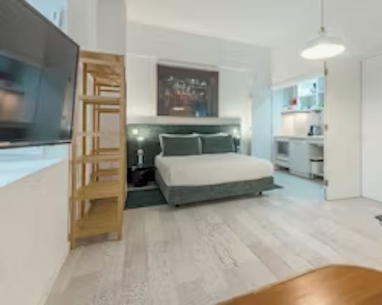 O apartamento tem um quarto espaçoso e luminoso (a casa de banho comunica com o quarto) para três adultos com uma pequena varanda e kitchenette totalmente equipada, incluindo máquina de lavar loiça. Os seus tetos altos contam com grandes obras de Luis Alegre e Pedro Amaral. A casa-de banho situa-se no quarto de casal.